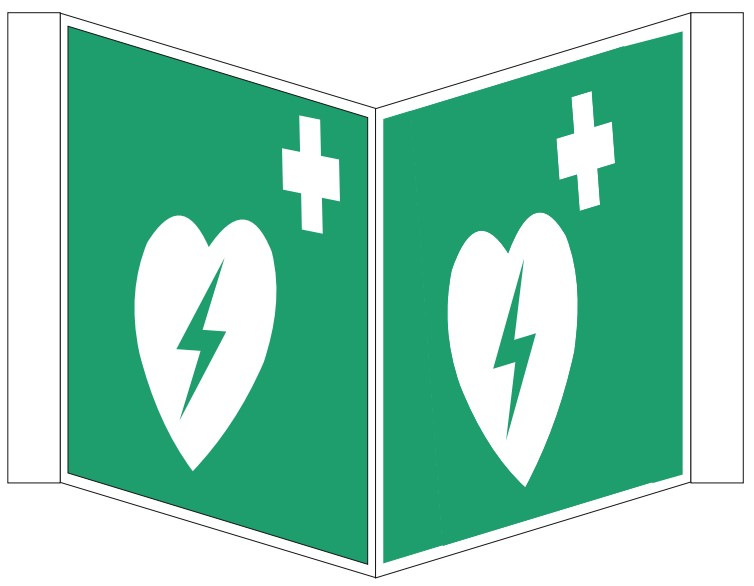 Angled shield printed on both sides with 2 “defibrillator” symbols
