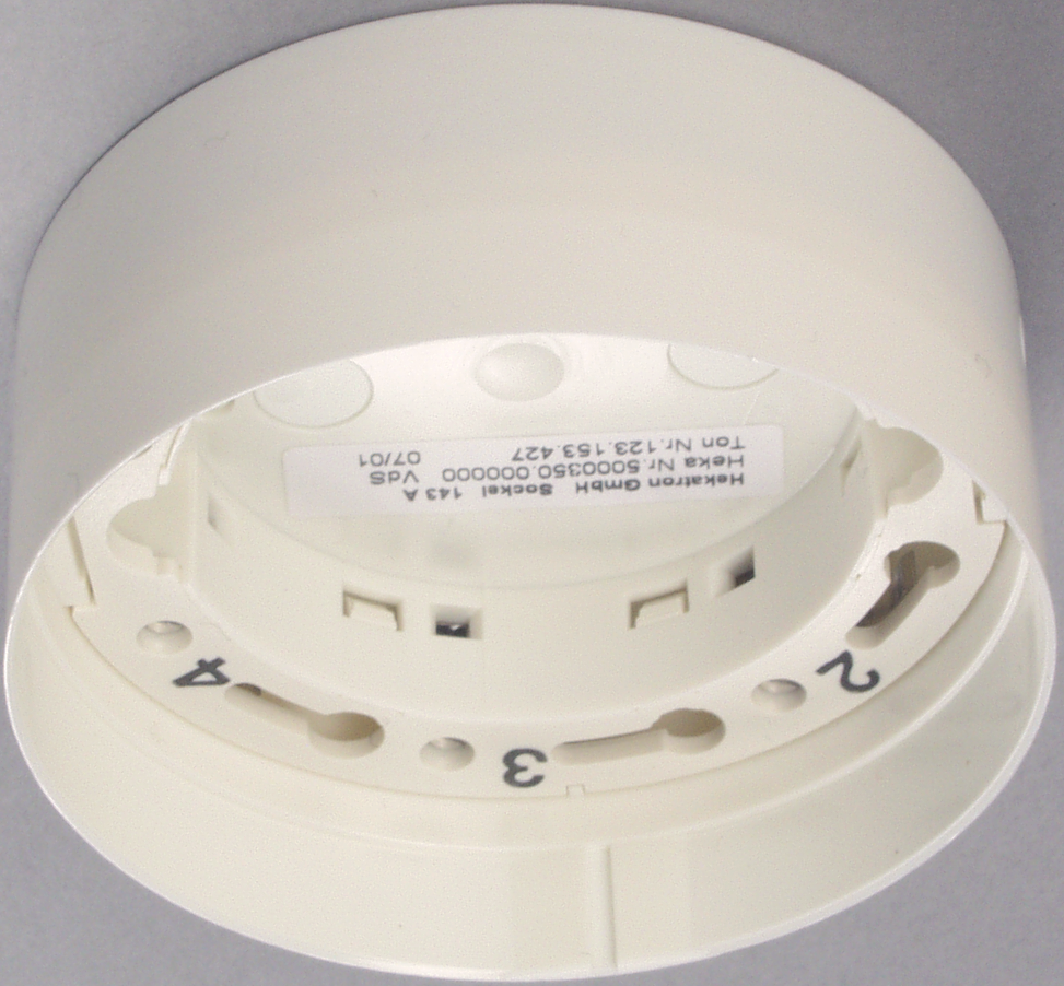 Surface-mounted mounting base for smoke and thermal switches in dry rooms, cable entry max. 9 mm, protection rating IP42