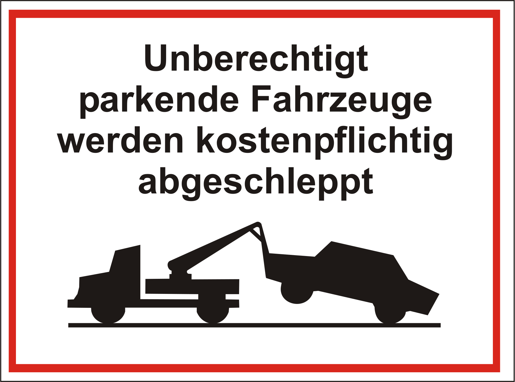 Text: Unberechtigt parkende Fahrzeuge werden kostenpflichtig abgeschleppt und Symbol Abschleppdienst
